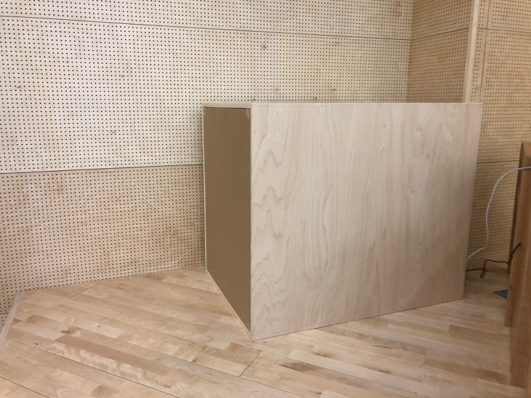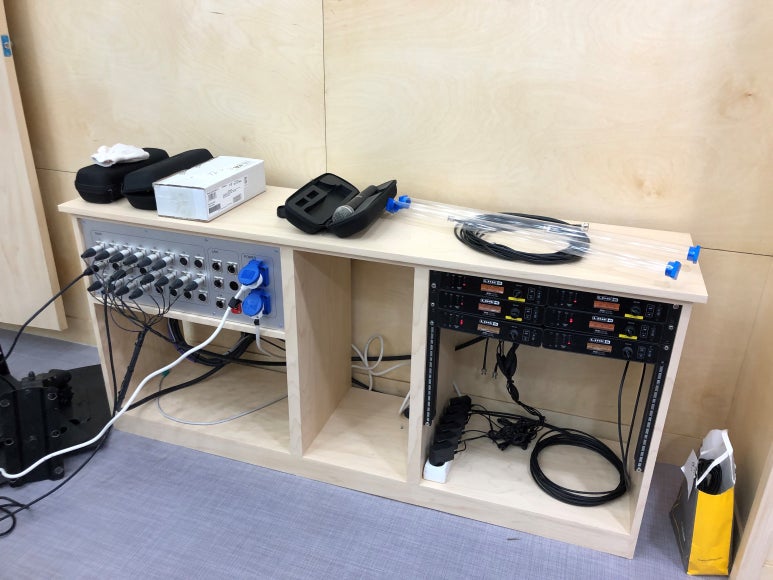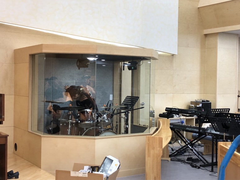 드럼 부스를 인테리어팀에서 제작을 하여 설치하고, 마이킹을 설치했습니다.
