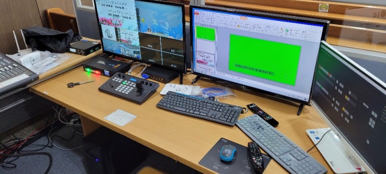 카메라 컨트롤러로는 MINRRAY. KBD2000, 스위처는 MLACKMAGIC. ATEM TELEVISION STUDIO HD를 설치해드렸습니다. 멀티뷰 모니터로는 사진에서 제일 왼쪽에 있는 32인치 티비를 설치해드렸습니다.