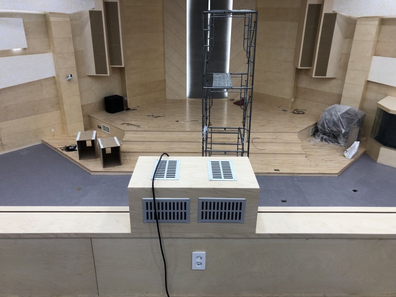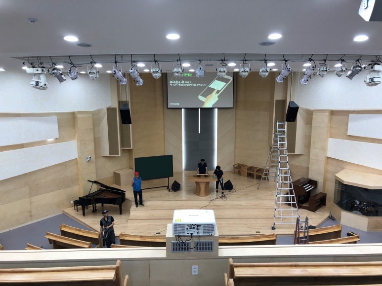 프로젝트는 #Panasonic PT-MZ770에 줌렌즈 ET-ELT22를 설치했습니다. 이 역시 교회의 요청으로 방열판을 설치한 커버를 제작했습니다. 스크린은 180인치 전동 매립으로 설치했습니다.