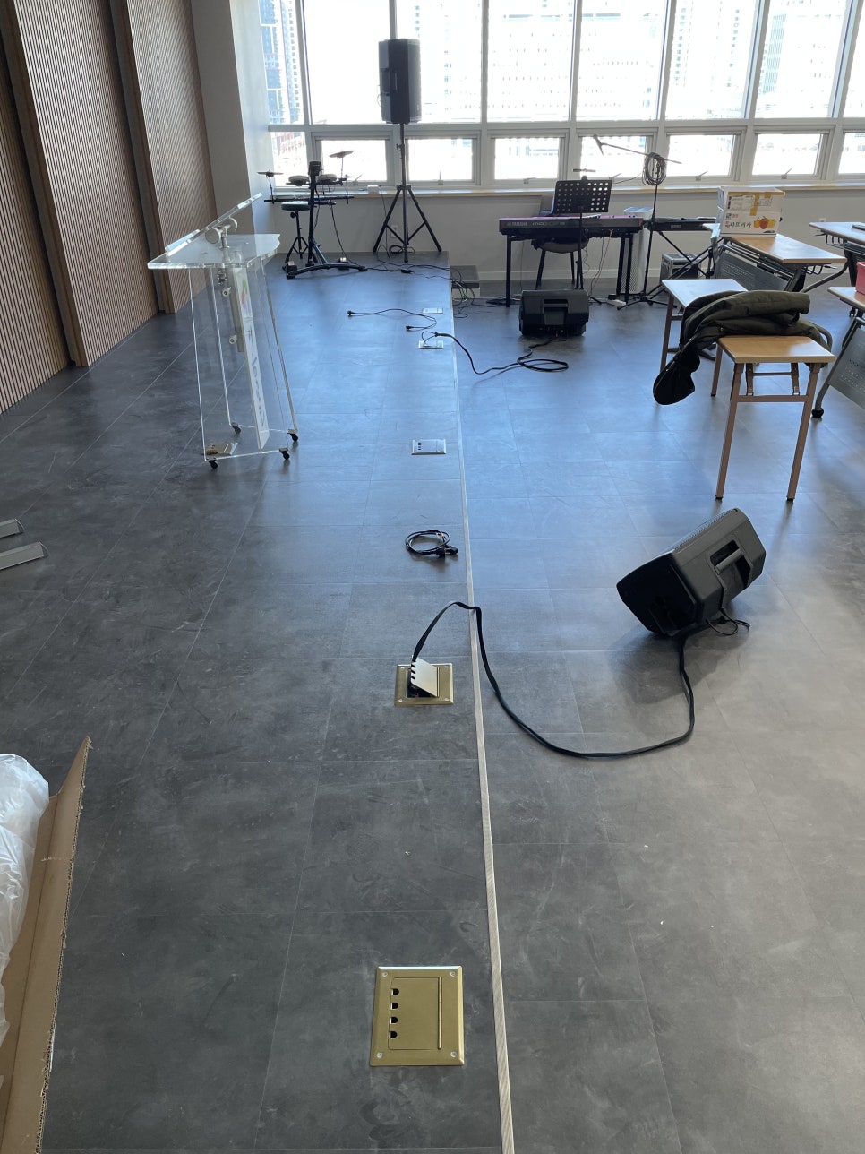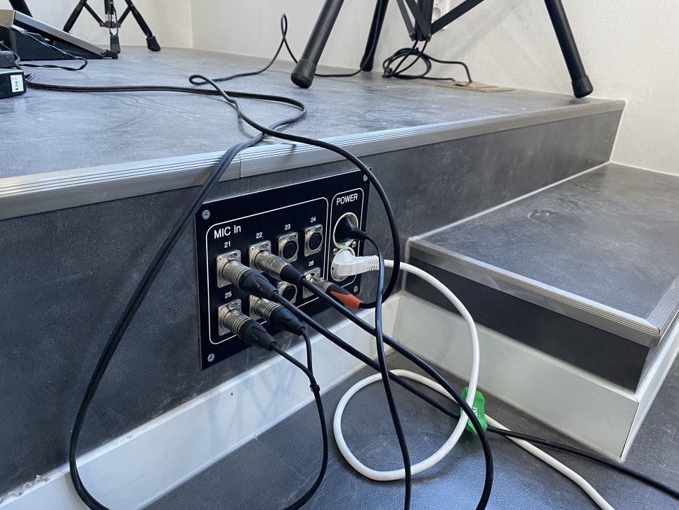 무대에는 마이크 박스를 만들었고, 멀티케이블을 이용해 뒤쪽에 있는 콘솔까지 연결했습니다.